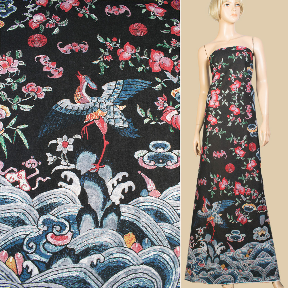 Лен черный, красные цветы, журавль, волны (1ст купон), ш.145 купить в розницу и оптом