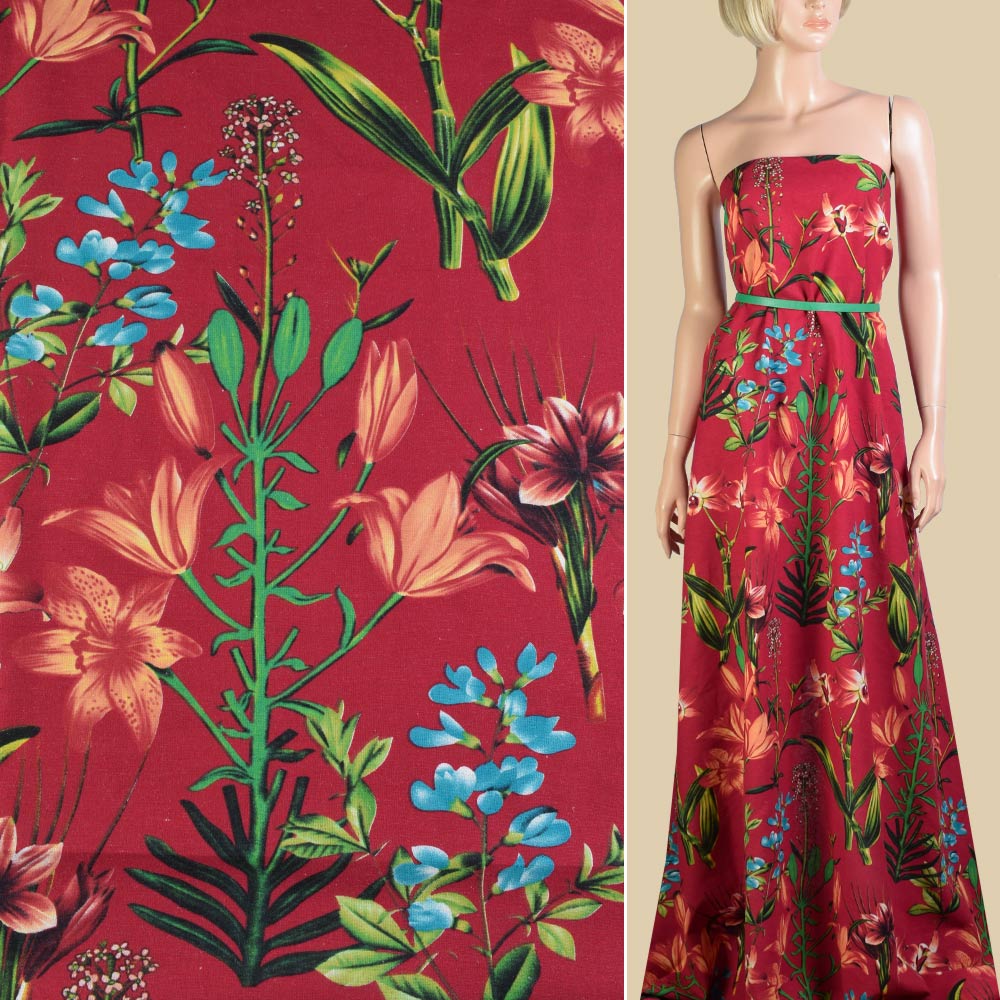 Лен красный, оранжевые лилии, зеленые листья, ш.150 купить в розницу и оптом