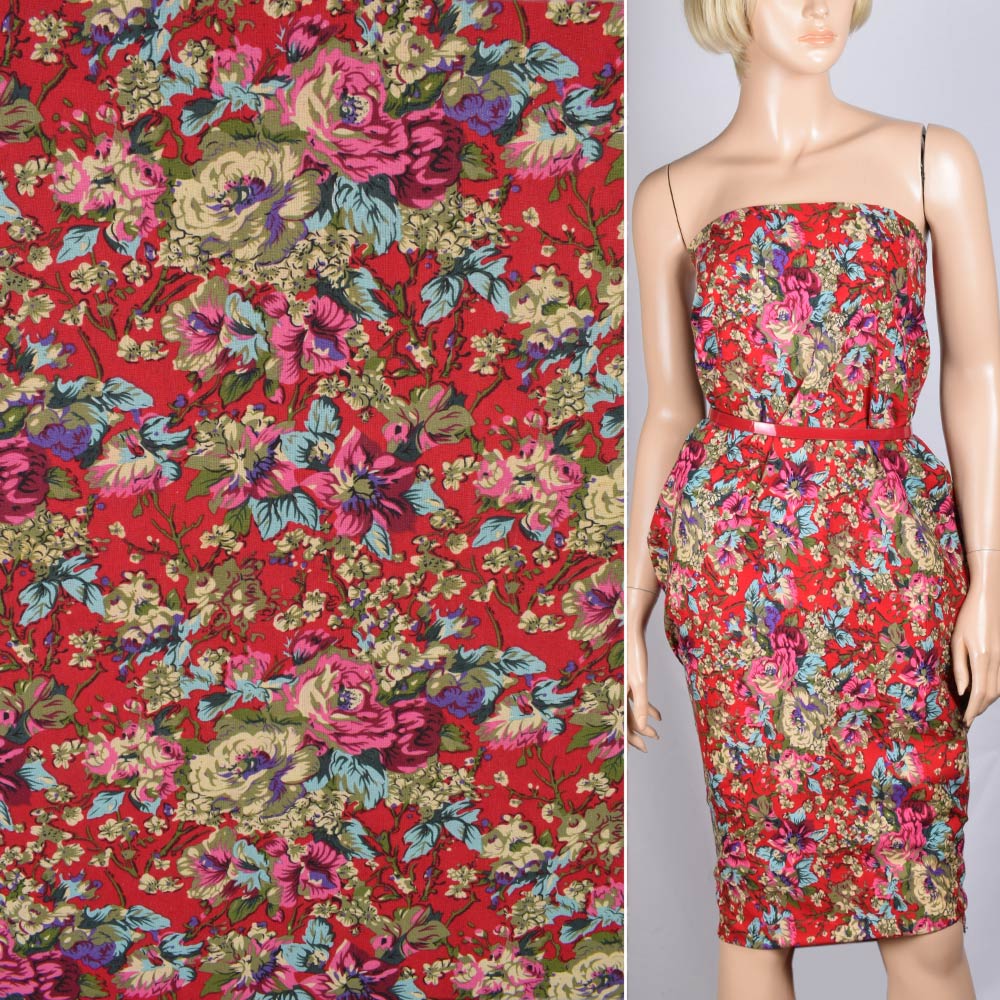 Лен красный с розово-голубыми и бежевыми цветами ш.145 купить в розницу и оптом