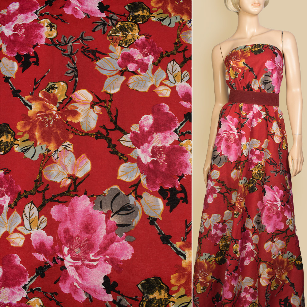 Лен красный в большие розовые цветы, ш.145. Состав ткани: Лён-70, Хлопок-30. Плотность ткани: 144 г/м.кв. Страна производитель: Южная Корея. Лен - материал средней плотности, натурального происхождения, используется для пошива летних изделий. Гигроскопичный, воздухопроницаемый, прочный, устойчив к носке, стирке и глаженью. Поверхность ткани матовая, а благодаря хлопку в составе, тактильно очень мягкая и приятная на ощупь, непрозрачна. В складках и сборках не имеет значительного формообразования, ложится мягко и пластично. Подходит для пошива брючных костюмов свободного кроя, пиджаков, платьев, юбок, сарафанов, рубашек.