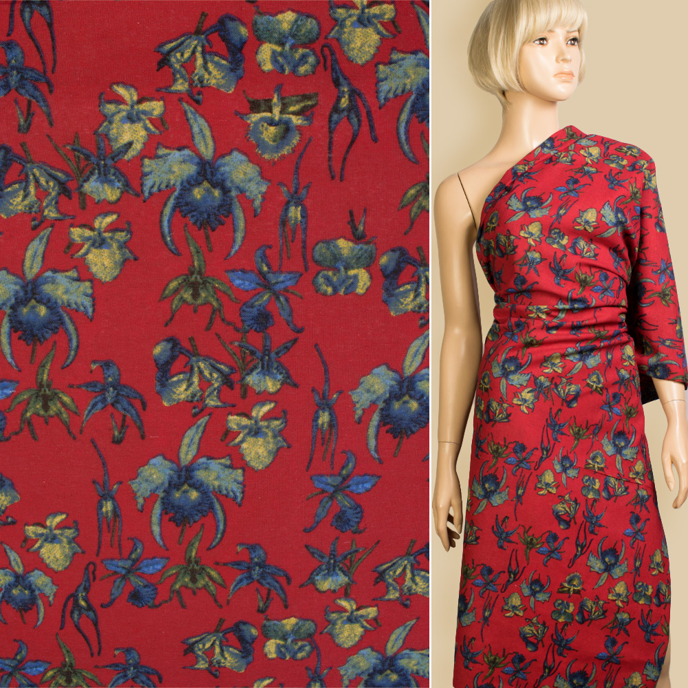 Лен красный в желто-синие орхидеи, ш.145. Состав ткани: Лён-70, Хлопок-30. Плотность ткани: 135 г/м.кв. Страна производитель: Южная Корея. Лен - материал средней плотности, натурального происхождения, используется для пошива летних изделий. Гигроскопичный, воздухопроницаемый, прочный, устойчив к носке, стирке и глаженью. Поверхность ткани матовая, а благодаря хлопку в составе, тактильно очень мягкая и приятная на ощупь, непрозрачна. В складках и сборках не имеет значительного формообразования, ложится мягко и пластично. Подходит для пошива брючных костюмов свободного кроя, пиджаков, платьев, юбок, сарафанов, рубашек.