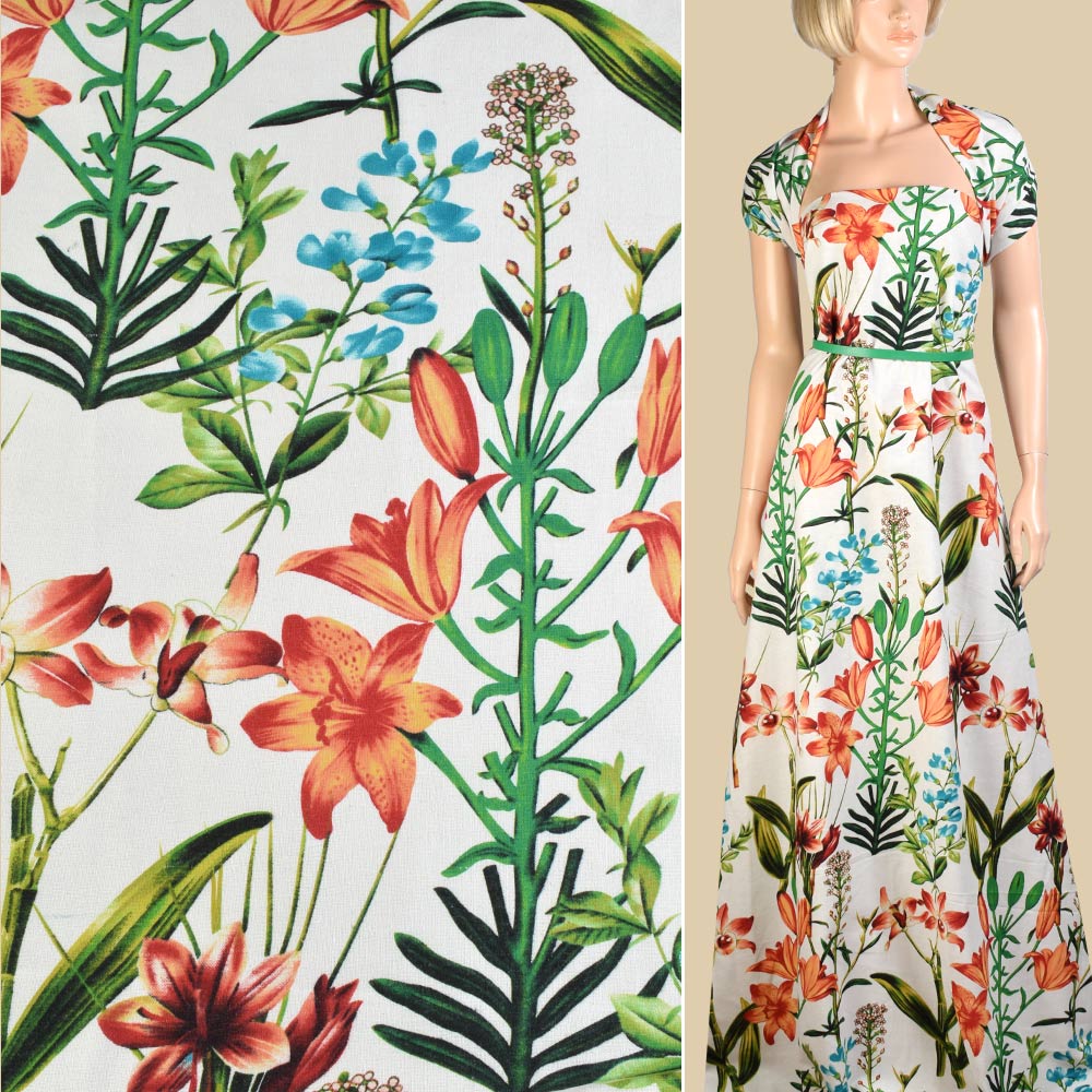 Лен молочный, оранжевые лилии, зеленые листья, ш.145 купить в розницу и оптом