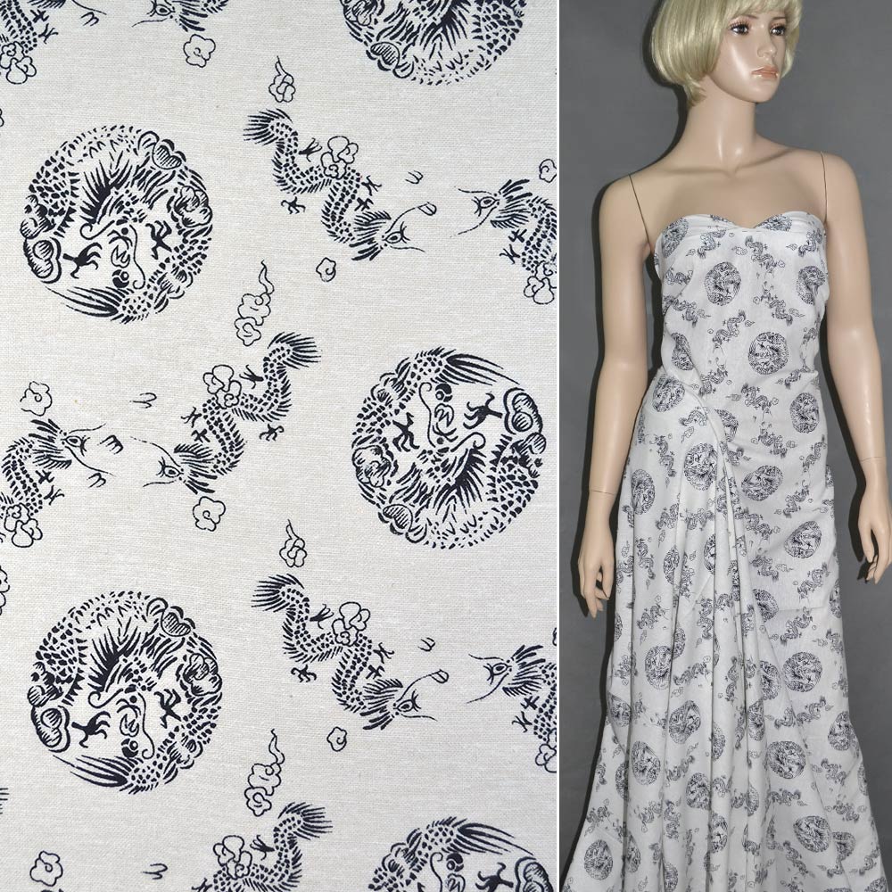 Лен молочный с черными драконами ш.142. Состав ткани: Лён-70, Хлопок-30. Плотность ткани: 150 г/м.кв. Страна производитель: Южная Корея. Лен - материал средней плотности, натурального происхождения, используется для пошива летних изделий. Гигроскопичный, воздухопроницаемый, прочный, устойчив к носке, стирке и глаженью. Поверхность ткани матовая, а благодаря хлопку в составе, тактильно очень мягкая и приятная на ощупь, непрозрачна. В складках и сборках не имеет значительного формообразования, ложится мягко и пластично. Подходит для пошива брючных костюмов свободного кроя, пиджаков, платьев, юбок, сарафанов, рубашек.