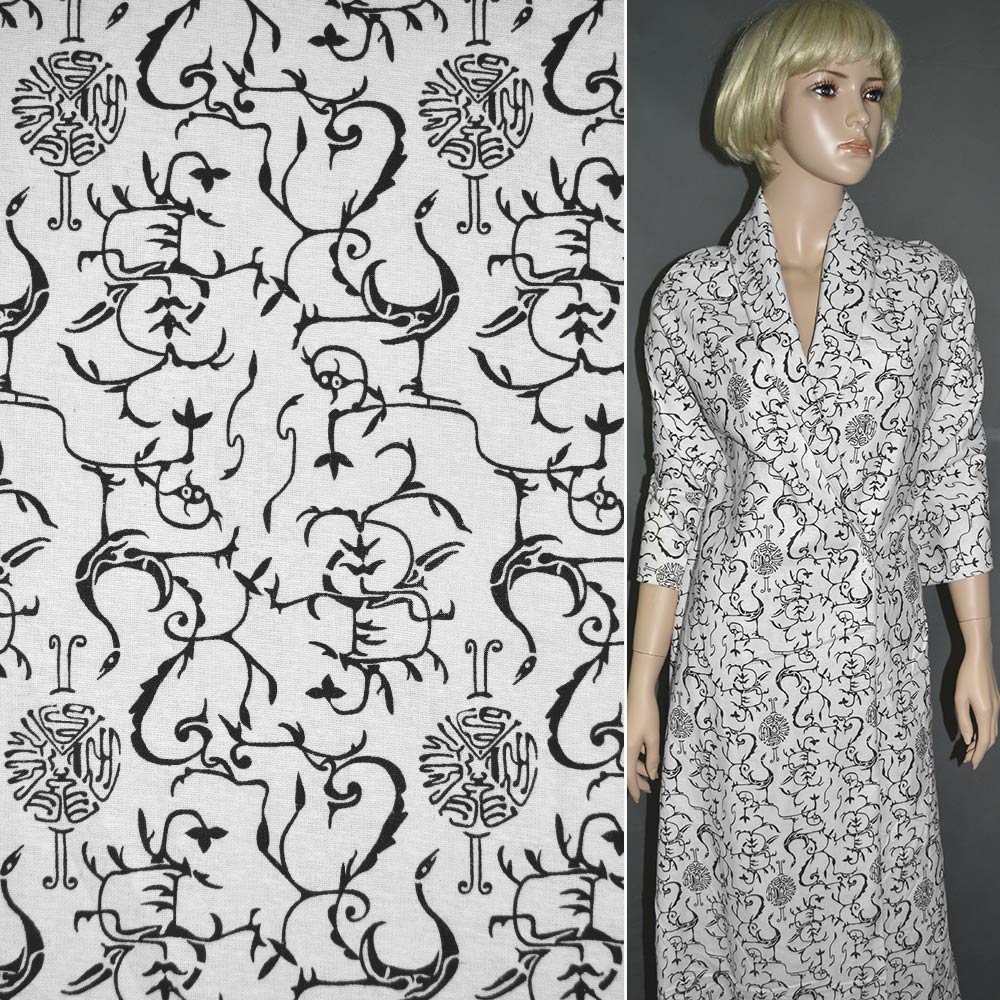 Лен молочный с черными завитками и птицами ш.145. Состав ткани: Лён-70, Хлопок-30. Плотность ткани: 145 г/м.кв. Страна производитель: Южная Корея. Лен - материал средней плотности, натурального происхождения, используется для пошива летних изделий. Гигроскопичный, воздухопроницаемый, прочный, устойчив к носке, стирке и глаженью. Поверхность ткани матовая, а благодаря хлопку в составе, тактильно очень мягкая и приятная на ощупь, непрозрачна. В складках и сборках не имеет значительного формообразования, ложится мягко и пластично. Подходит для пошива брючных костюмов свободного кроя, пиджаков, платьев, юбок, сарафанов, рубашек.