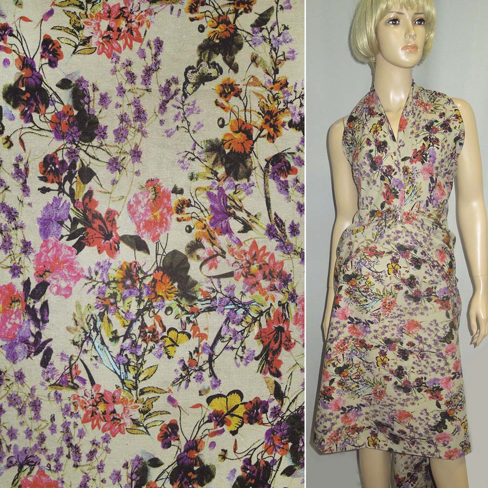 Лен оливковый с разноцветными цветами и бабочками ш.145 купить в розницу и оптом