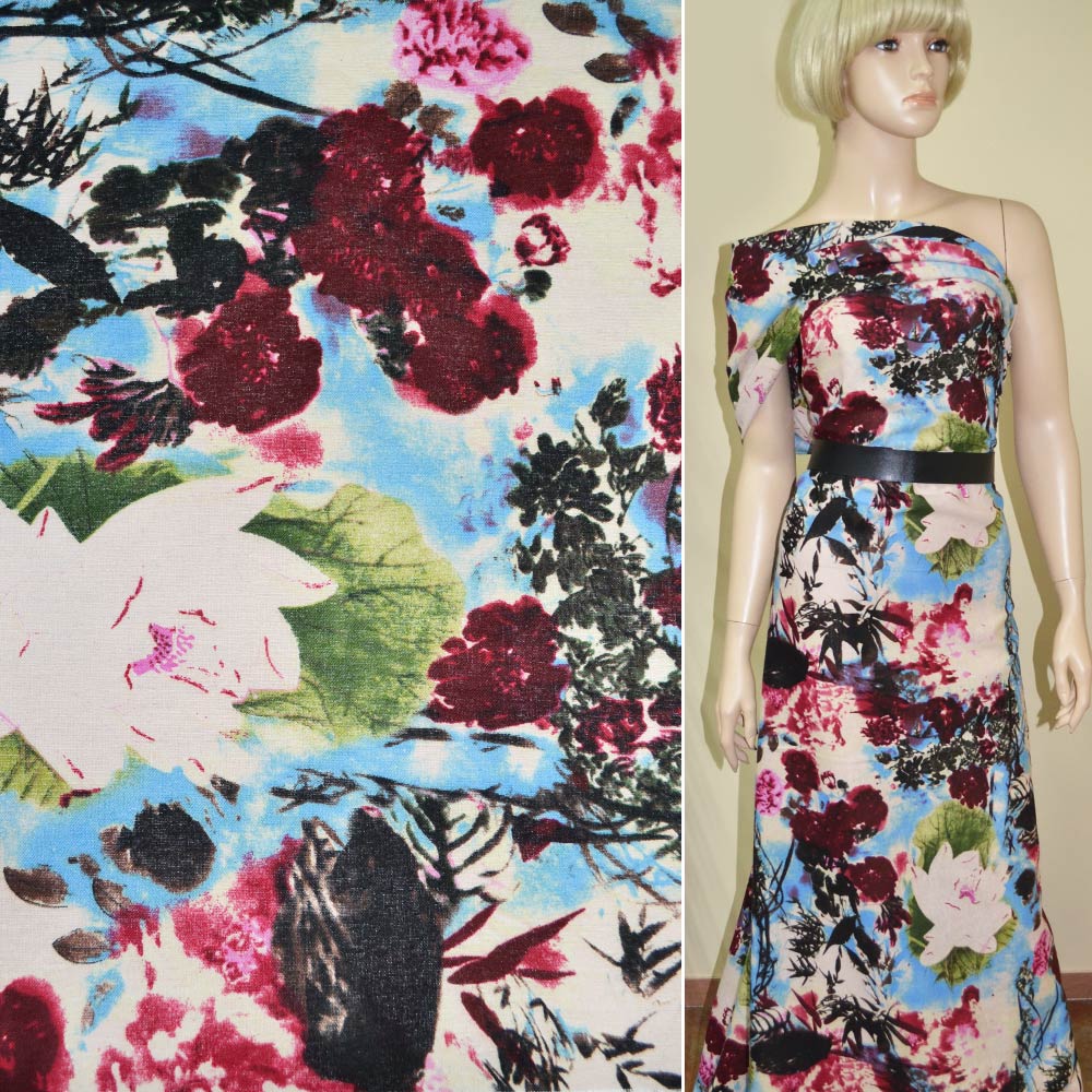 Лен песочный светлый с розово-бордовыми цветами ш.145. Состав ткани: Лён-70, Хлопок-30. Плотность ткани: 136 г/м.кв. Страна производитель: Южная Корея. Лен - материал средней плотности, натурального происхождения, используется для пошива летних изделий. Гигроскопичный, воздухопроницаемый, прочный, устойчив к носке, стирке и глаженью. Поверхность ткани матовая, а благодаря хлопку в составе, тактильно очень мягкая и приятная на ощупь, непрозрачна. В складках и сборках не имеет значительного формообразования, ложится мягко и пластично. Подходит для пошива брючных костюмов свободного кроя, пиджаков, платьев, юбок, сарафанов, рубашек.