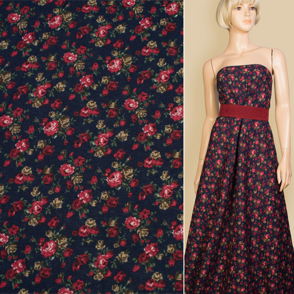 Лен синий темный с красными розами, ш.145. Состав ткани: Лён-70, Хлопок-30. Плотность ткани: 132 г/м.кв. Страна производитель: Южная Корея. Лен - материал средней плотности, натурального происхождения, используется для пошива летних изделий. Гигроскопичный, воздухопроницаемый, прочный, устойчив к носке, стирке и глаженью. Поверхность ткани матовая, а благодаря хлопку в составе, тактильно очень мягкая и приятная на ощупь, непрозрачна. В складках и сборках не имеет значительного формообразования, ложится мягко и пластично. Подходит для пошива брючных костюмов свободного кроя, пиджаков, платьев, юбок, сарафанов, рубашек.