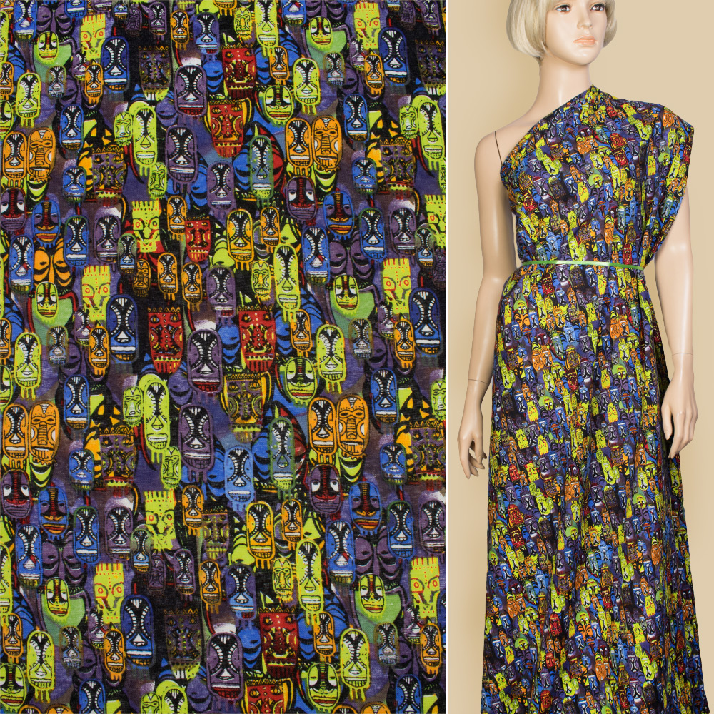 Лен синий в красные, оранжевые, фиолетовые африканские маски, ш.150. Состав ткани: Лён-70, Хлопок-30. Плотность ткани: 144 г/м.кв. Страна производитель: Южная Корея. Лен - материал средней плотности, натурального происхождения, используется для пошива летних изделий. Гигроскопичный, воздухопроницаемый, прочный, устойчив к носке, стирке и глаженью. Поверхность ткани матовая, а благодаря хлопку в составе, тактильно очень мягкая и приятная на ощупь, непрозрачна. В складках и сборках не имеет значительного формообразования, ложится мягко и пластично. Подходит для пошива брючных костюмов свободного кроя, пиджаков, платьев, юбок, сарафанов, рубашек.