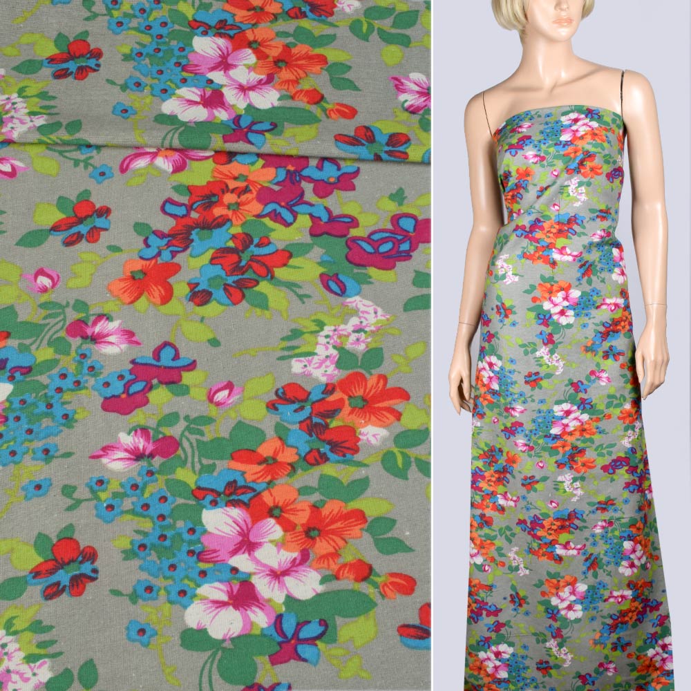 Лен светло-серый в оранжево-бордовые цветы ш.140 купить в розницу и оптом