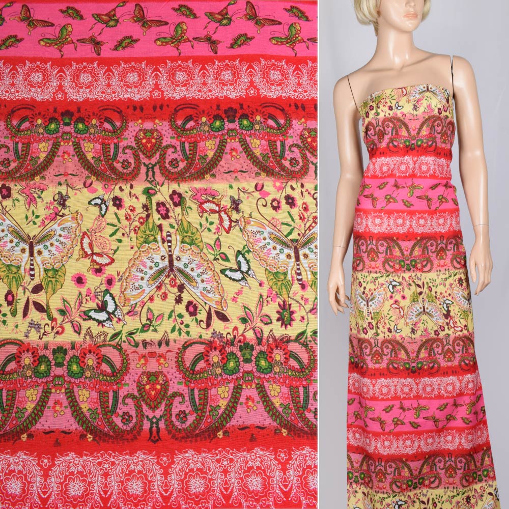 Лен в розово-желтые полосы с бабочками и цветами ш.150 купить в розницу и оптом