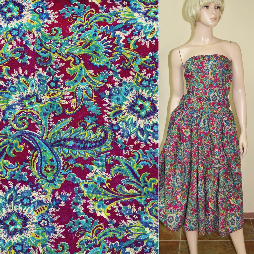 Лен вишневый с бирюзово-желтыми огурцами ш.145. Состав ткани: Лён-70, Хлопок-30. Плотность ткани: 141 г/м.кв. Страна производитель: Южная Корея. Лен - материал средней плотности, натурального происхождения, используется для пошива летних изделий. Гигроскопичный, воздухопроницаемый, прочный, устойчив к носке, стирке и глаженью. Поверхность ткани матовая, а благодаря хлопку в составе, тактильно очень мягкая и приятная на ощупь, непрозрачна. В складках и сборках не имеет значительного формообразования, ложится мягко и пластично. Подходит для пошива брючных костюмов свободного кроя, пиджаков, платьев, юбок, сарафанов, рубашек.