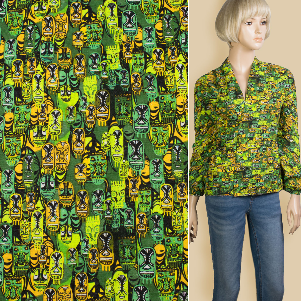 Лен зеленый в желтые, оранжевые, зеленые африканские маски, ш.145 купить в розницу и оптом