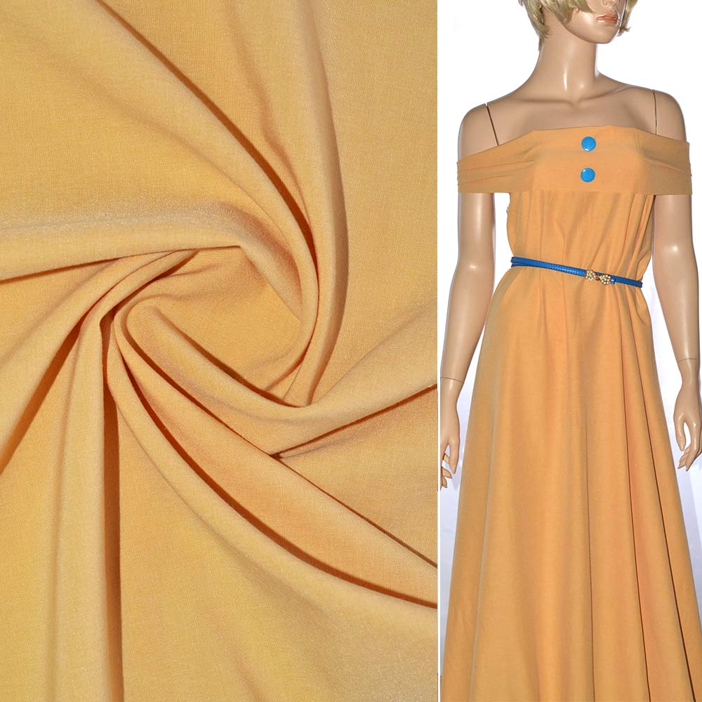 Поплин стрейчевый желто-персиковый ш.150. Состав ткани: Вискоза-80, Полиамид-13, Эластан-7. Плотность ткани: 123 г/м.кв. Страна производитель: Южная Корея. Поплин представляет собой гладкий, воздушный, приятный на ощупь, нежный материал. В жаркое время в одежде из поплина будет комфортно, так как ткань обладает отличной воздухопроницаемостью. Ткань приятно лежит на теле, не раздражает чувствительную кожу. Она хорошо кроится, легко шьется, изделия из неё хорошо сохраняют форму. Благодаря эластану в составе материал хорошо тянется и сразу же возвращается в первоначальный вид. Используется для изготовления летних платьев, блуз, женского и детского белья, мужских сорочек и т. д. Несмотря на легкость и тонкость, вещи из поплина отлично сохраняют форму.