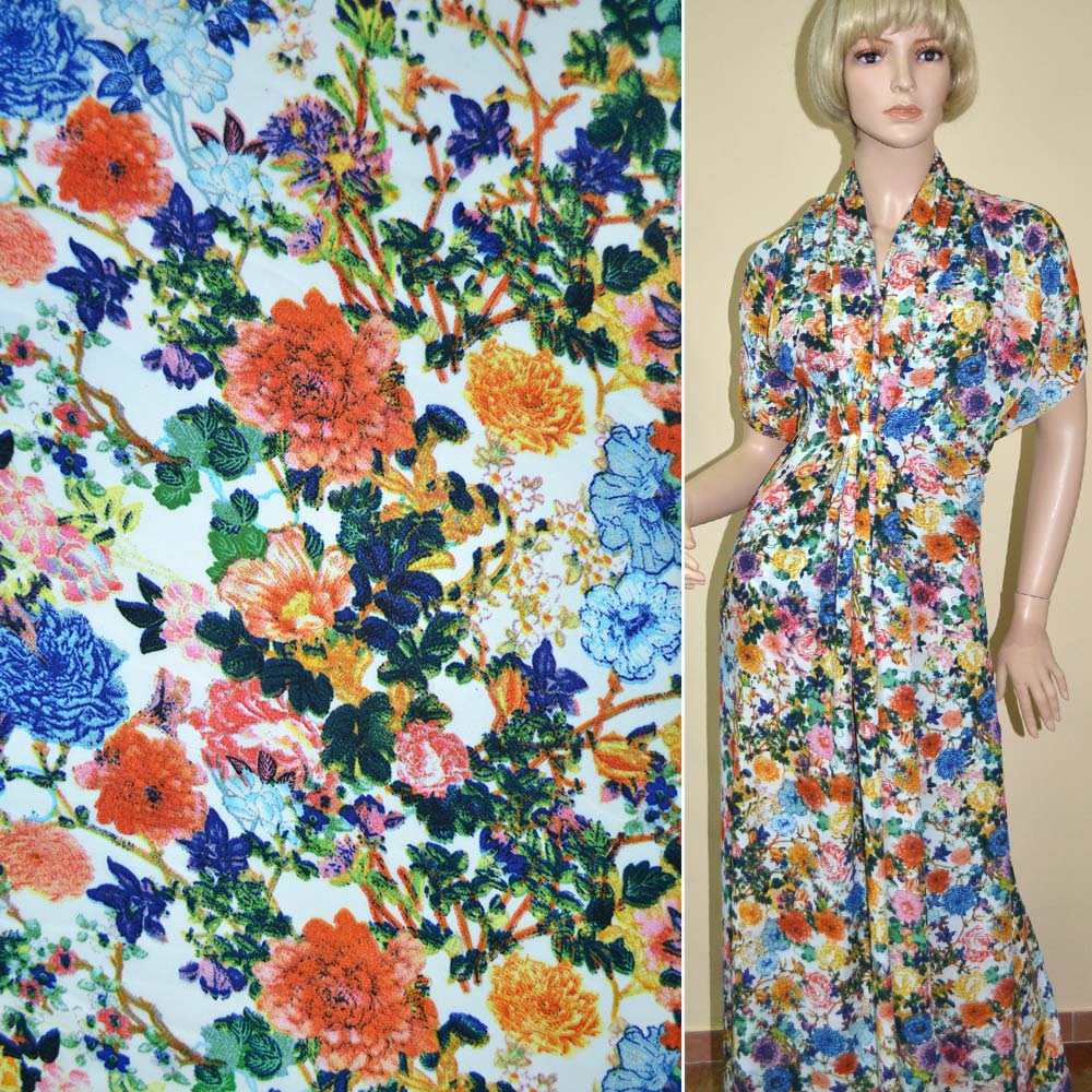 Креп поплин белый с сине-желто-розовыми цветами ш.150. Состав ткани: Вискоза-40, Полиэстер-60. Плотность ткани: 100 г/м.кв. Страна производитель: Южная Корея. Лицевая сторона материи имеет выраженный рельефный рисунок, а изнаночная гладкая и очень приятная к телу. Красивый шероховатый узор образуется благодаря уникальному плетению нитей полотна. Изделия из этой материи идеально садятся по фигуре. Креп практически не мнется, устойчив к износу и практичен. Стрейч-креп хорошо тянущаяся ткань, которая прекрасно восстанавливает форму. Данные свойства позволяют использовать креп при изготовлении разнообразной одежды.