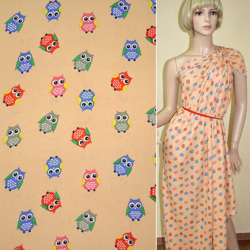 Креп поплин персиковый с разноцветными совами ш.150. Состав ткани: Вискоза-40, Полиэстер-60. Плотность ткани: 103 г/м.кв. Страна производитель: Южная Корея. Лицевая сторона материи имеет выраженный рельефный рисунок, а изнаночная гладкая и очень приятная к телу. Красивый шероховатый узор образуется благодаря уникальному плетению нитей полотна. Изделия из этой материи идеально садятся по фигуре. Креп практически не мнется, устойчив к износу и практичен. Стрейч-креп хорошо тянущаяся ткань, которая прекрасно восстанавливает форму. Данные свойства позволяют использовать креп при изготовлении разнообразной одежды.