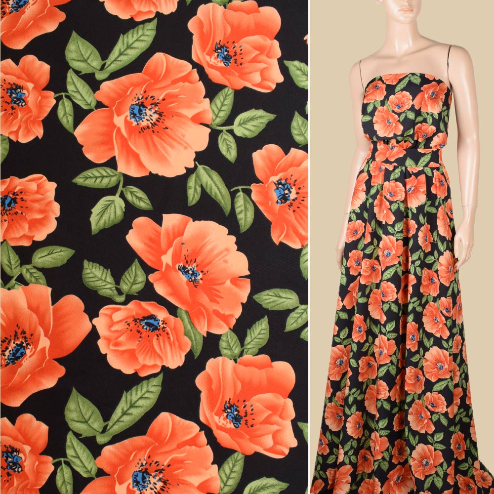 Поплин черный, красно-оранжевые маки, ш.150. Состав ткани: Полиэстер-100. Плотность ткани: 82 г/м.кв. Страна производитель: Южная Корея. Поплин представляет собой гладкий, воздушный, приятный на ощупь, нежный материал. В жаркое время в одежде из поплина будет комфортно, так как ткань обладает отличной воздухопроницаемостью. Ткань приятно лежит на теле, не раздражает чувствительную кожу. Она хорошо кроится, легко шьется, изделия из неё хорошо сохраняют форму. Используется для изготовления летних платьев, блуз, женского и детского белья, мужских сорочек и т. д. Несмотря на легкость и тонкость, вещи из поплина отлично сохраняют форму.