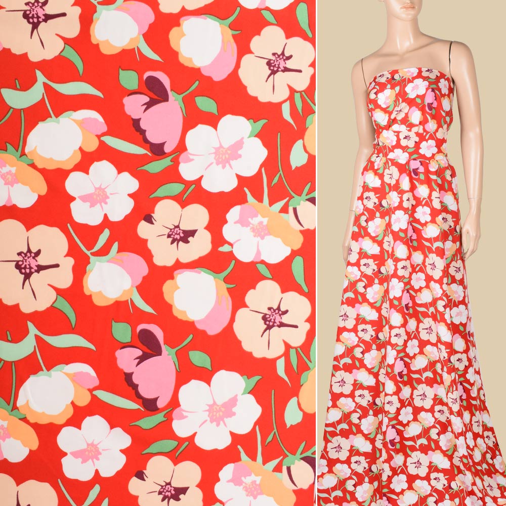 Поплин красный, белые, бежевые цветы, ш.150. Состав ткани: Полиэстер-100. Плотность ткани: 82 г/м.кв. Страна производитель: Южная Корея. Поплин представляет собой гладкий, воздушный, приятный на ощупь, нежный материал. В жаркое время в одежде из поплина будет комфортно, так как ткань обладает отличной воздухопроницаемостью. Ткань приятно лежит на теле, не раздражает чувствительную кожу. Она хорошо кроится, легко шьется, изделия из неё хорошо сохраняют форму. Используется для изготовления летних платьев, блуз, женского и детского белья, мужских сорочек и т. д. Несмотря на легкость и тонкость, вещи из поплина отлично сохраняют форму.
