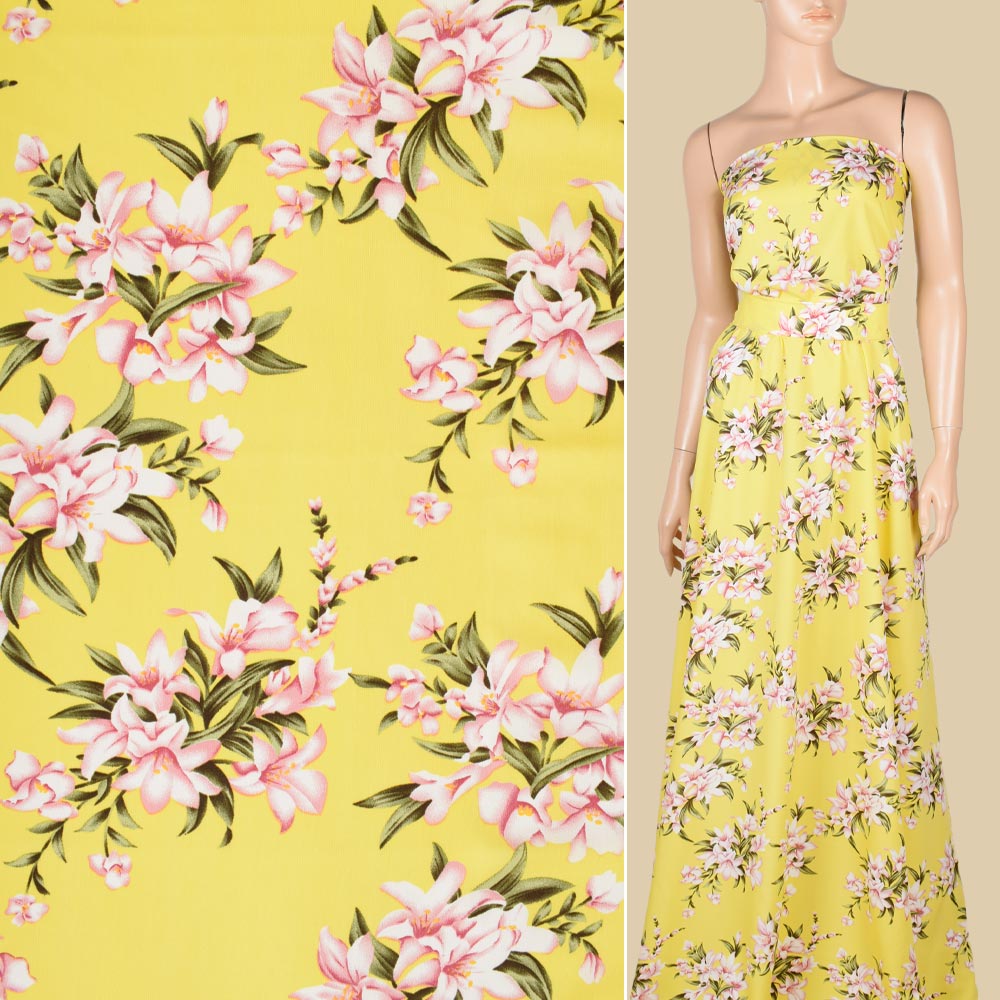 Поплин лимонный, розовые лилии, ш.150. Состав ткани: Полиэстер-100. Плотность ткани: 78 г/м.кв. Страна производитель: Южная Корея. Поплин представляет собой гладкий, воздушный, приятный на ощупь, нежный материал. В жаркое время в одежде из поплина будет комфортно, так как ткань обладает отличной воздухопроницаемостью. Ткань приятно лежит на теле, не раздражает чувствительную кожу. Она хорошо кроится, легко шьется, изделия из неё хорошо сохраняют форму. Используется для изготовления летних платьев, блуз, женского и детского белья, мужских сорочек и т. д. Несмотря на легкость и тонкость, вещи из поплина отлично сохраняют форму.