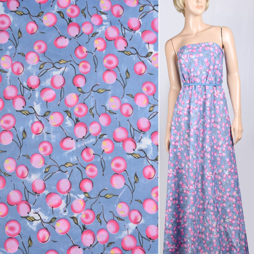 Поплин синий светлый с розовыми ягодами ш.150. Состав ткани: Вискоза-30, Полиамид-35, Полиэстер-35. Плотность ткани: 68 г/м.кв. Страна производитель: Южная Корея. Поплин представляет собой гладкий, воздушный, приятный на ощупь, нежный материал. В жаркое время в одежде из поплина будет комфортно, так как ткань обладает отличной воздухопроницаемостью. Ткань приятно лежит на теле, не раздражает чувствительную кожу. Она хорошо кроится, легко шьется, изделия из неё хорошо сохраняют форму. Используется для изготовления летних платьев, блуз, женского и детского белья, мужских сорочек и т. д. Несмотря на легкость и тонкость, вещи из поплина отлично сохраняют форму.