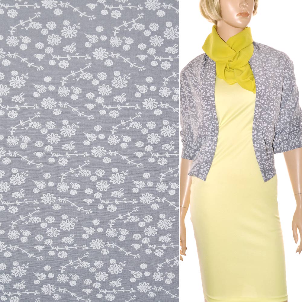 Поплин стрейч серый с белыми цветами ш.150. Состав ткани: Вискоза-80, Полиамид-13, Эластан-7. Плотность ткани: 135 г/м.кв. Страна производитель: Южная Корея. Поплин представляет собой гладкий, воздушный, приятный на ощупь, нежный материал. В жаркое время в одежде из поплина будет комфортно, так как ткань обладает отличной воздухопроницаемостью. Ткань приятно лежит на теле, не раздражает чувствительную кожу. Она хорошо кроится, легко шьется, изделия из неё хорошо сохраняют форму. Используется для изготовления летних платьев, блуз, женского и детского белья, мужских сорочек и т. д. Несмотря на легкость и тонкость, вещи из поплина отлично сохраняют форму.