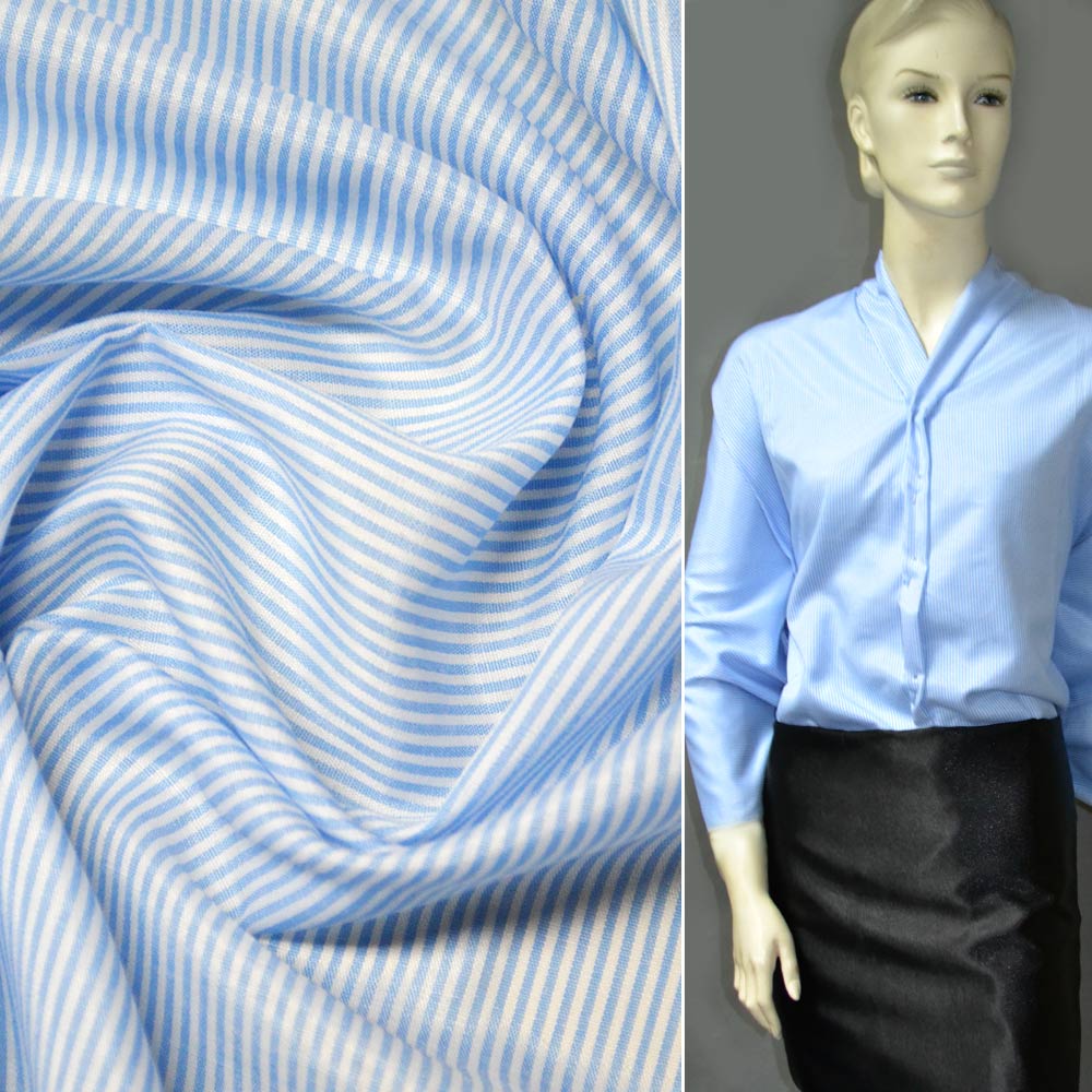 Рубашечная ткань в полоску бело-голубую, ш.145. Состав ткани: Вискоза-20, Полиэстер-50, Хлопок-30. Плотность ткани: 78 г/м.кв. Страна производитель: Южная Корея. Рубашечная ткань - тонкая, имеет гладкую поверхность. Качественный состав материала обеспечивает гигроскопичность, практичность и функциональность. Благодаря натуральным волокнам, ткань не вызывает аллергических реакций и долгое время сохраняет свой первоначальный вид. Ткань качественная, приятная к телу, слегка держит форму, хорошо драпируется.