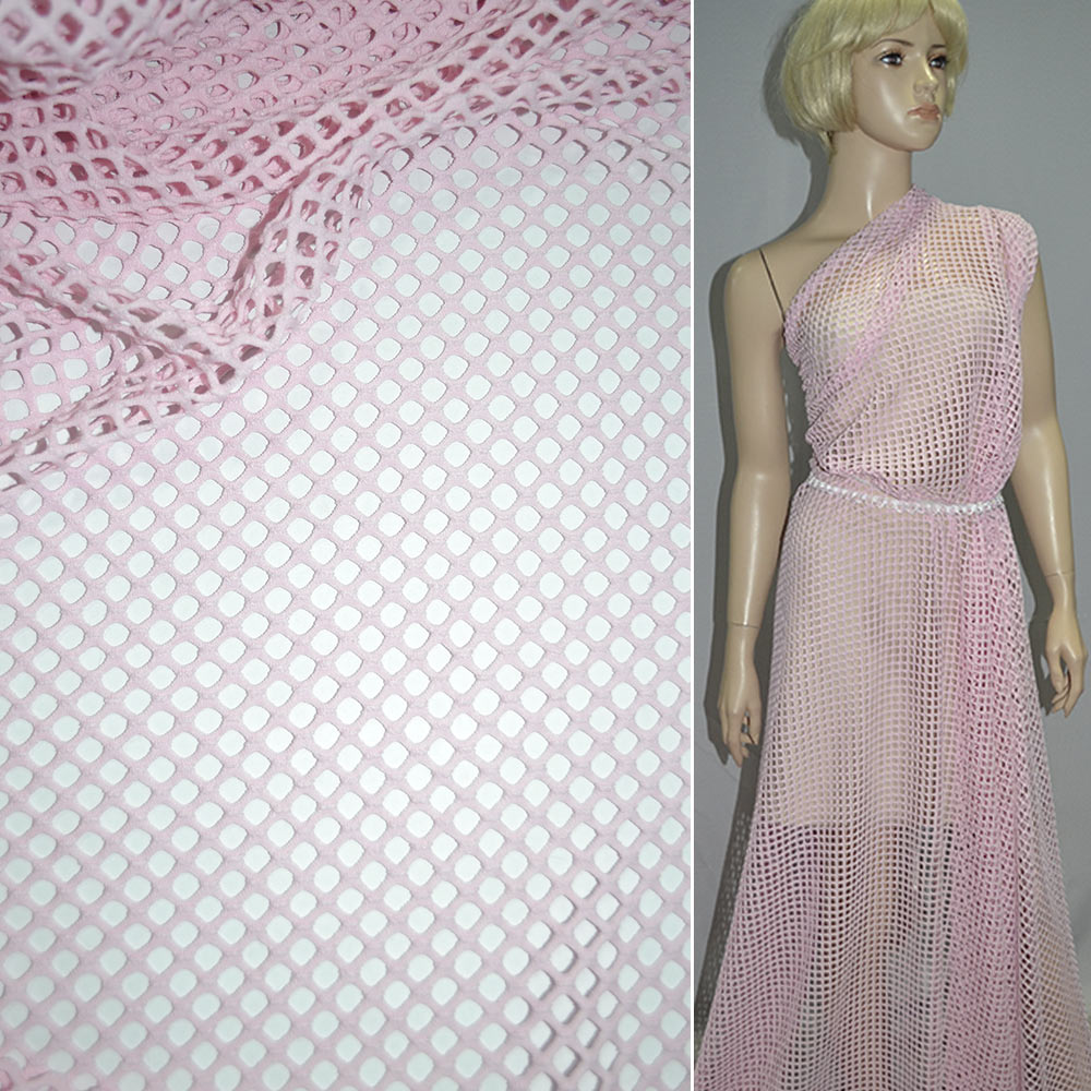 Сетка трикотажная розовая ш.150. Состав ткани: Вискоза-20, Полиамид-20, Полиэстер-55, Эластан-5. Плотность ткани: 162 г/м.кв. Страна производитель: Южная Корея. Трикотаж стрейч сетка кабаре - это эластичная ткань с крупными ромбовидными отверстиями. Благодаря своему уникальному составу и дизайну это эффектная ткань с большой эластичностью. Отверстия шириной примерно 1 см равномерно расположены между собой по всей ткани. Эта ткань имеет четырехстороннее растяжение, что делает эту ткань универсальной для работы. Она прекрасно подходит для всех видов костюмов, танцевальной одежды, домашнего декора, украшений, платьев, белья.