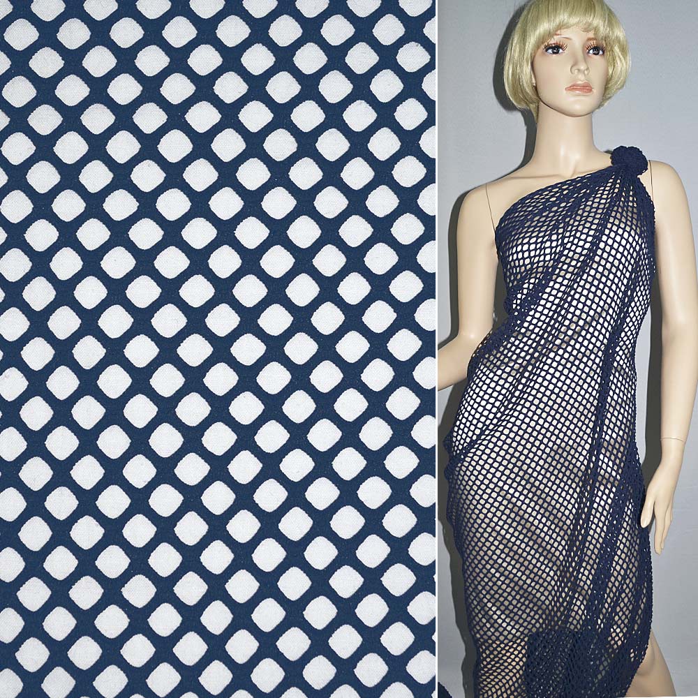 Сетка трикотажная синяя темный ш.150. Состав ткани: Вискоза-20, Полиамид-20, Полиэстер-55, Эластан-5. Плотность ткани: 157 г/м.кв. Страна производитель: Южная Корея. Трикотаж стрейч сетка кабаре - это эластичная ткань с крупными ромбовидными отверстиями. Благодаря своему уникальному составу и дизайну это эффектная ткань с большой эластичностью. Отверстия шириной примерно 1 см равномерно расположены между собой по всей ткани. Эта ткань имеет четырехстороннее растяжение, что делает эту ткань универсальной для работы. Она прекрасно подходит для всех видов костюмов, танцевальной одежды, домашнего декора, украшений, платьев, белья.