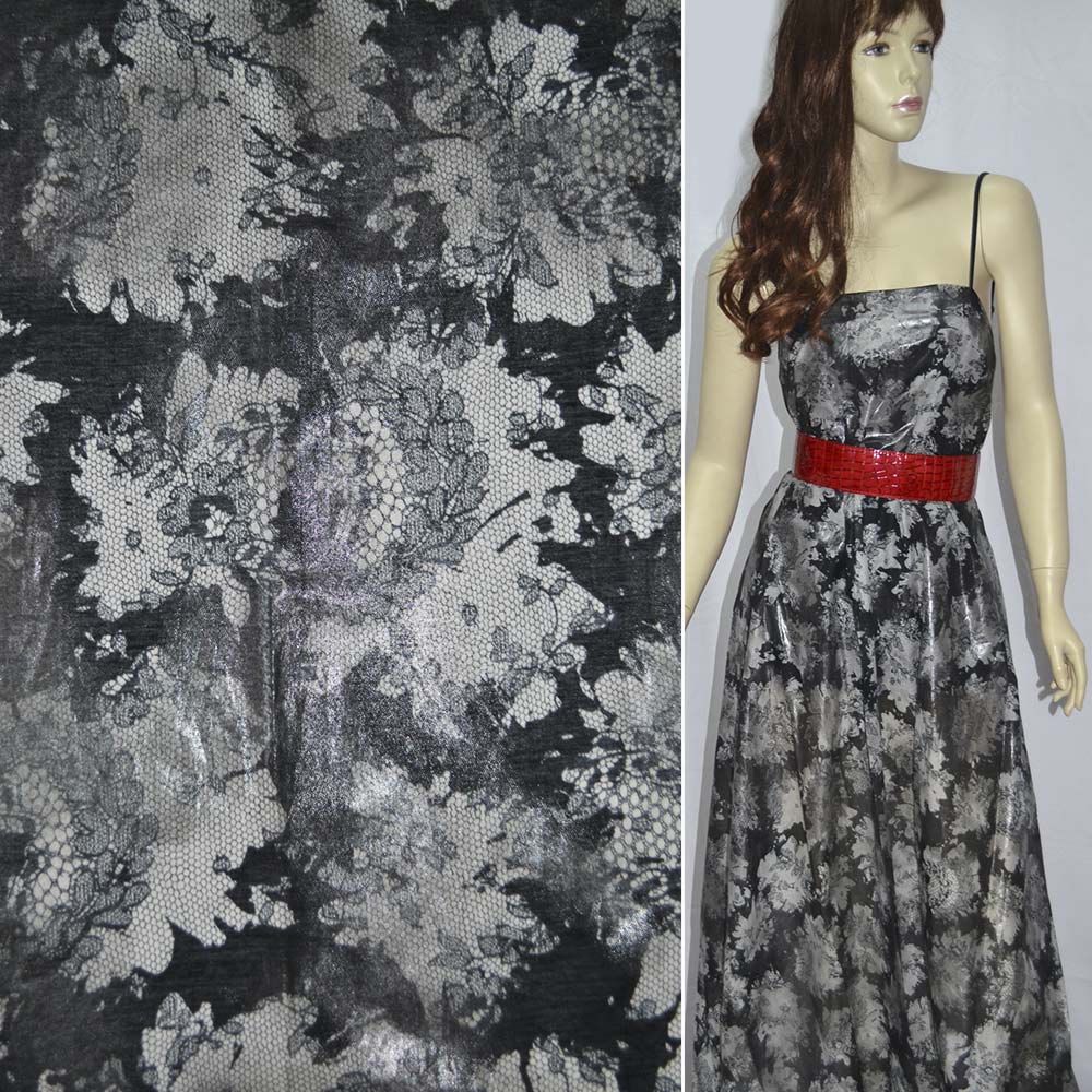 Шелк черный с белым принтом гипюр и напылением ш.137 купить в розницу и оптом