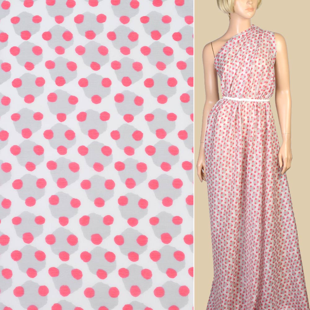 Шелк с хлопком белый в серые монеты и малиновый горох ш.135 купить в розницу и оптом
