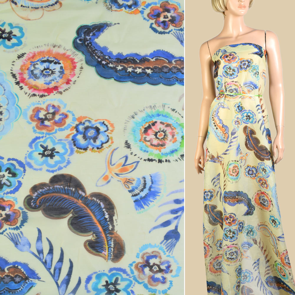 Шелк с хлопком салатовый светлый в акварельные цветы ш.140 купить в розницу и оптом