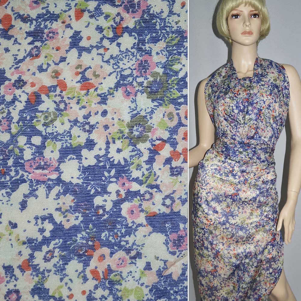 Шелк синий светлый в молочно-красные цветы ш.140 купить в розницу и оптом