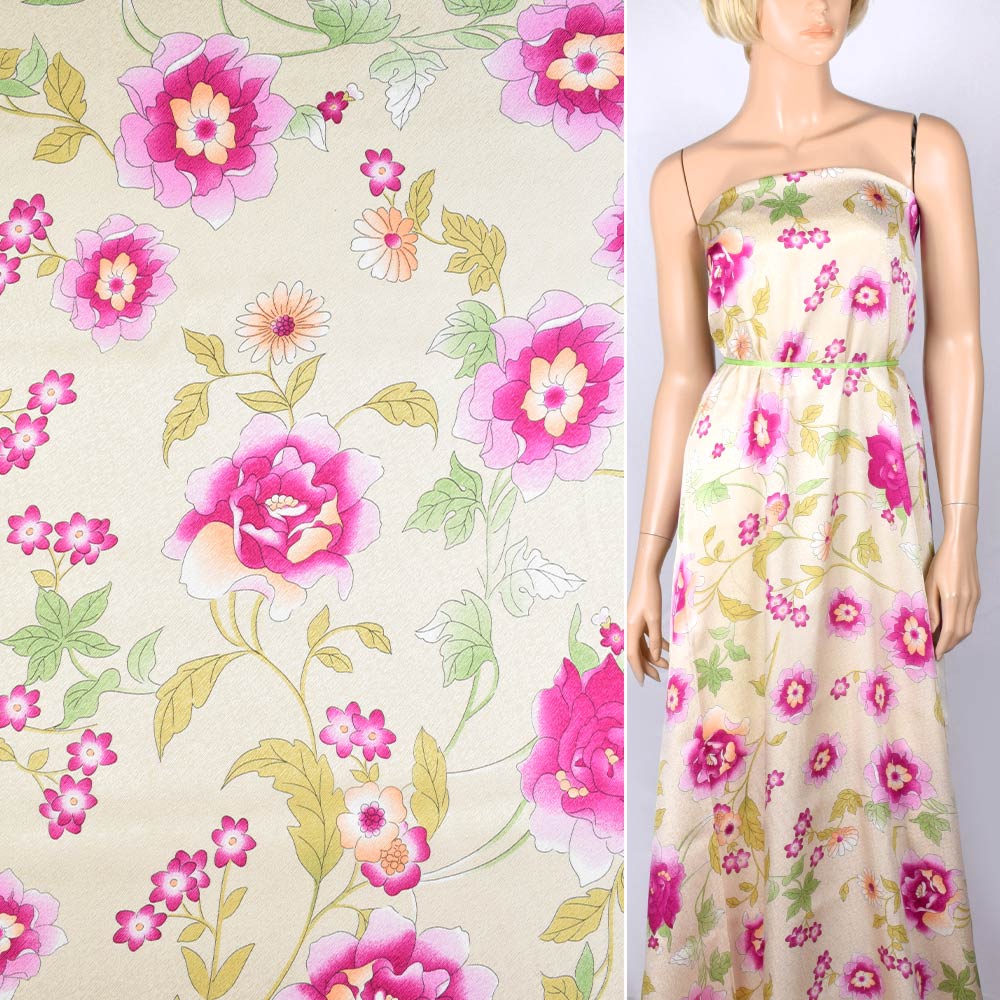 Шелк кремовый с оранжево-бордовыми цветами. Состав ткани: Шелк-100. Плотность ткани: 65 г/м.кв. Страна производитель: Германия. Натуральный шелк – гладкая, приятная на ощупь, пластичная ткань с мягким блеском. Материал не вызывает аллергии, обладает высокой гигроскопичностью, будет комфортен в носке в любое время года. Натуральный шелк не электризуется, не прилипает к коже, не накапливает статическое напряжение. Шелковые вещи износостойкие и длительное время будут сохранять свой первоначальный вид благодаря прочности плетения нити. Шелк отлично сочетается практически со всеми видами ткани.
