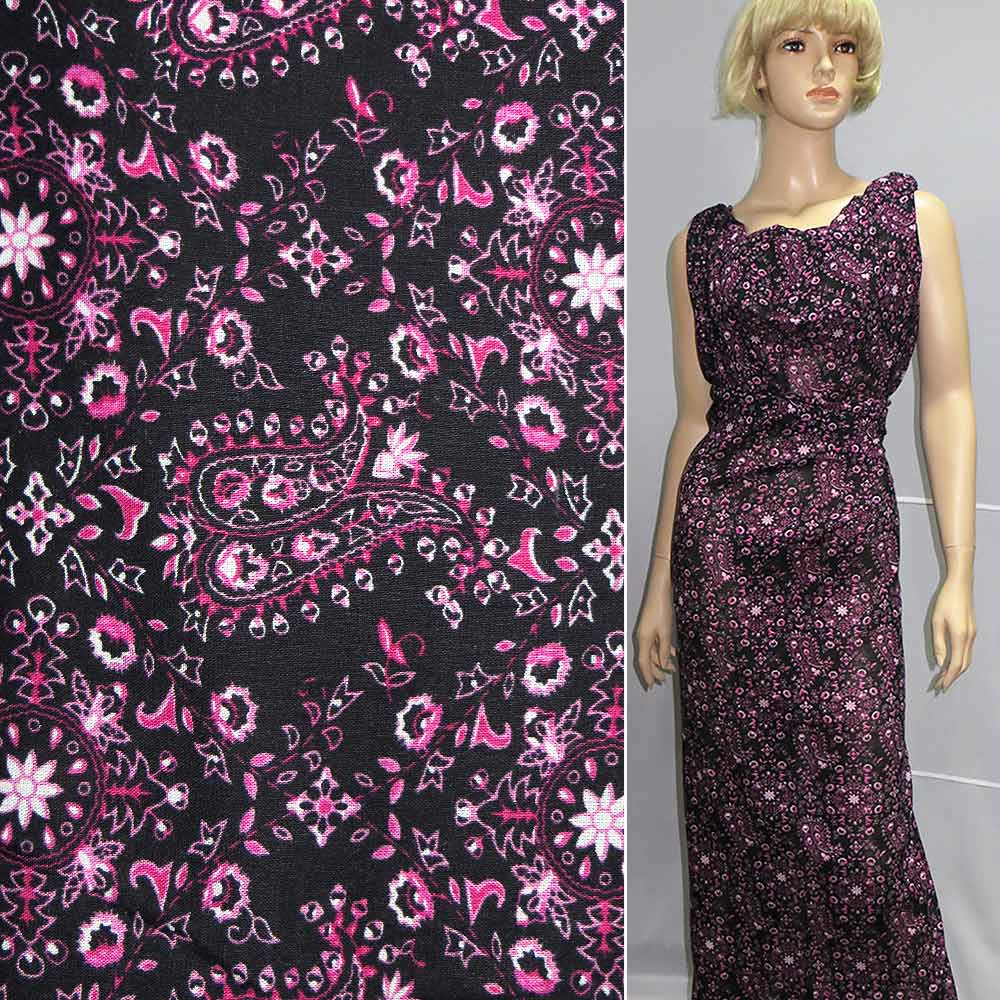 Штапель черный с мелкими малиновыми цветами и огурцами ш.140 купить в розницу и оптом