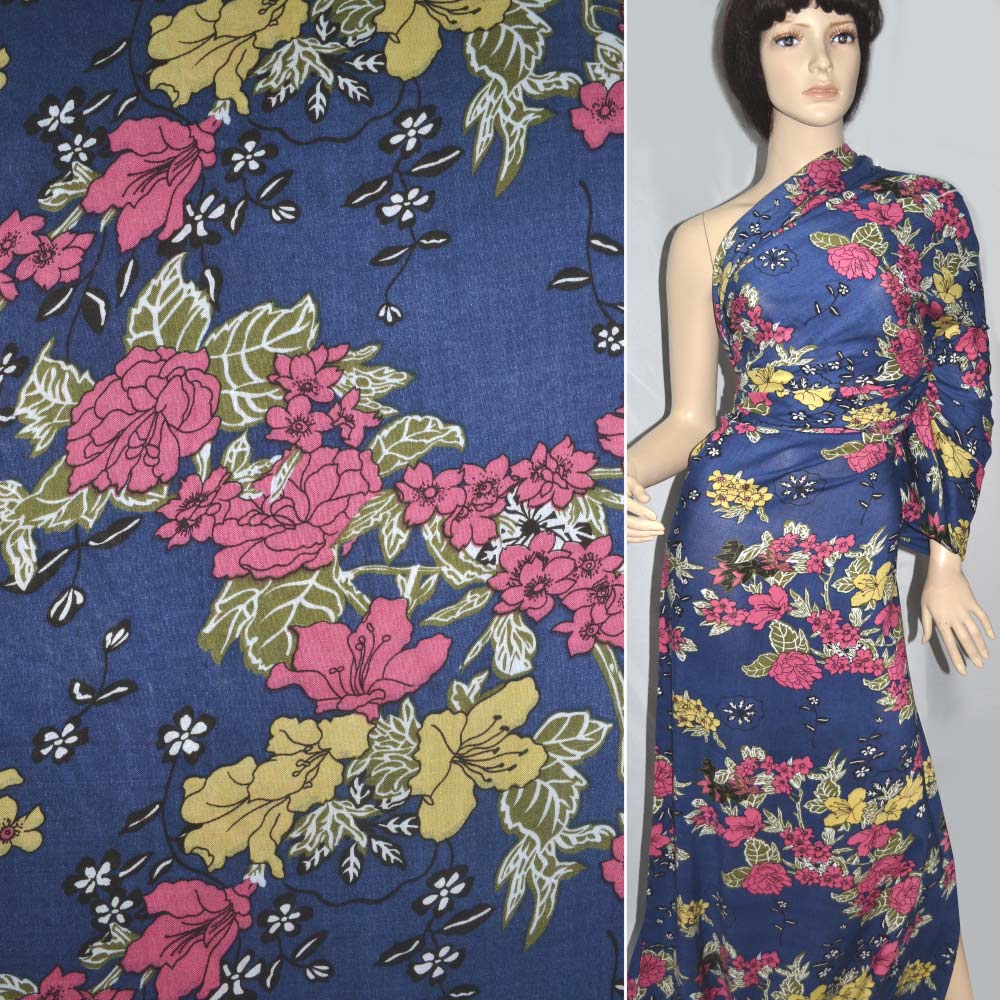Штапель* синий с черными и светло-бордовыми цветами купить в розницу и оптом
