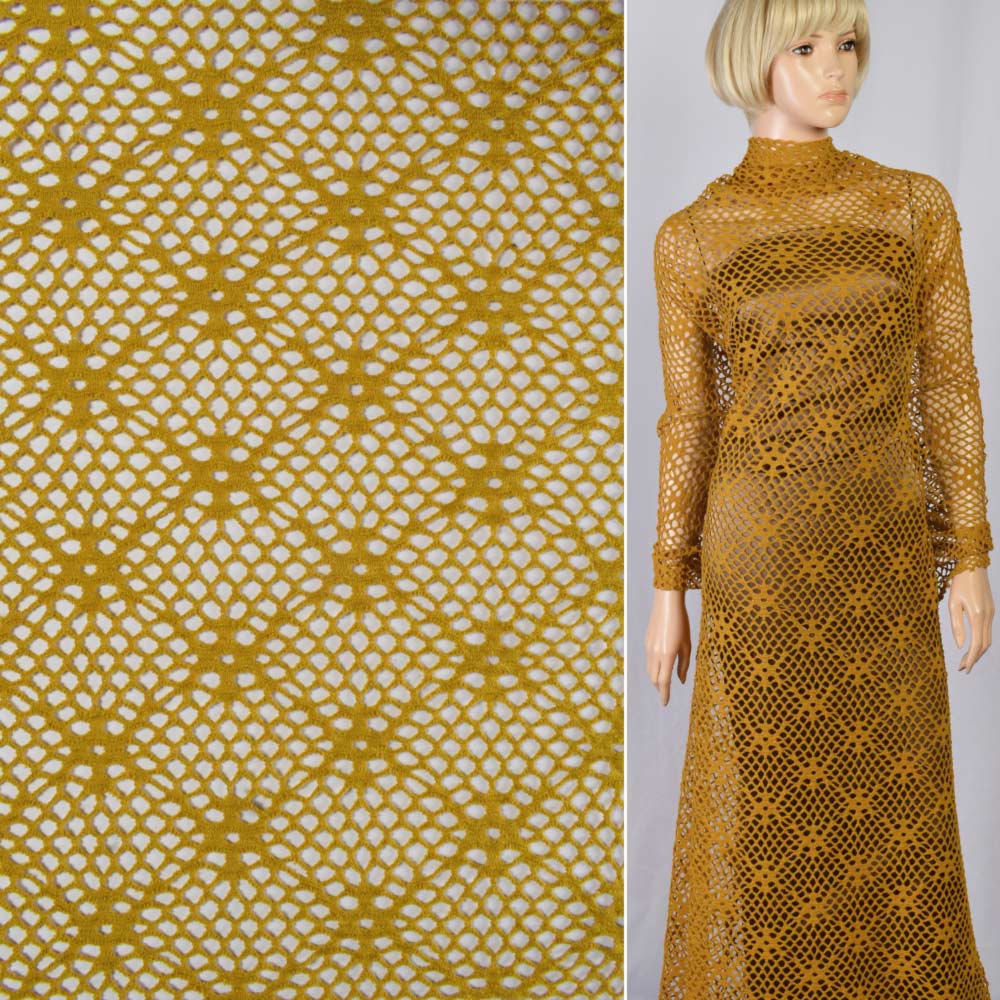 Сетка трикотажная горчичная, ш.165. Состав ткани: Акрил-50, Полиэстер-50. Плотность ткани: 156 г/м.кв. Страна производитель: Южная Корея. Трикотаж стрейч сетка кабаре - это эластичная ткань с крупными ромбовидными отверстиями. Благодаря своему уникальному составу и дизайну это эффектная ткань с большой эластичностью. Отверстия шириной примерно 1 см равномерно расположены между собой по всей ткани. Эта ткань имеет четырехстороннее растяжение, что делает эту ткань универсальной для работы. Она прекрасно подходит для всех видов костюмов, танцевальной одежды, домашнего декора, украшений, платьев, белья.
