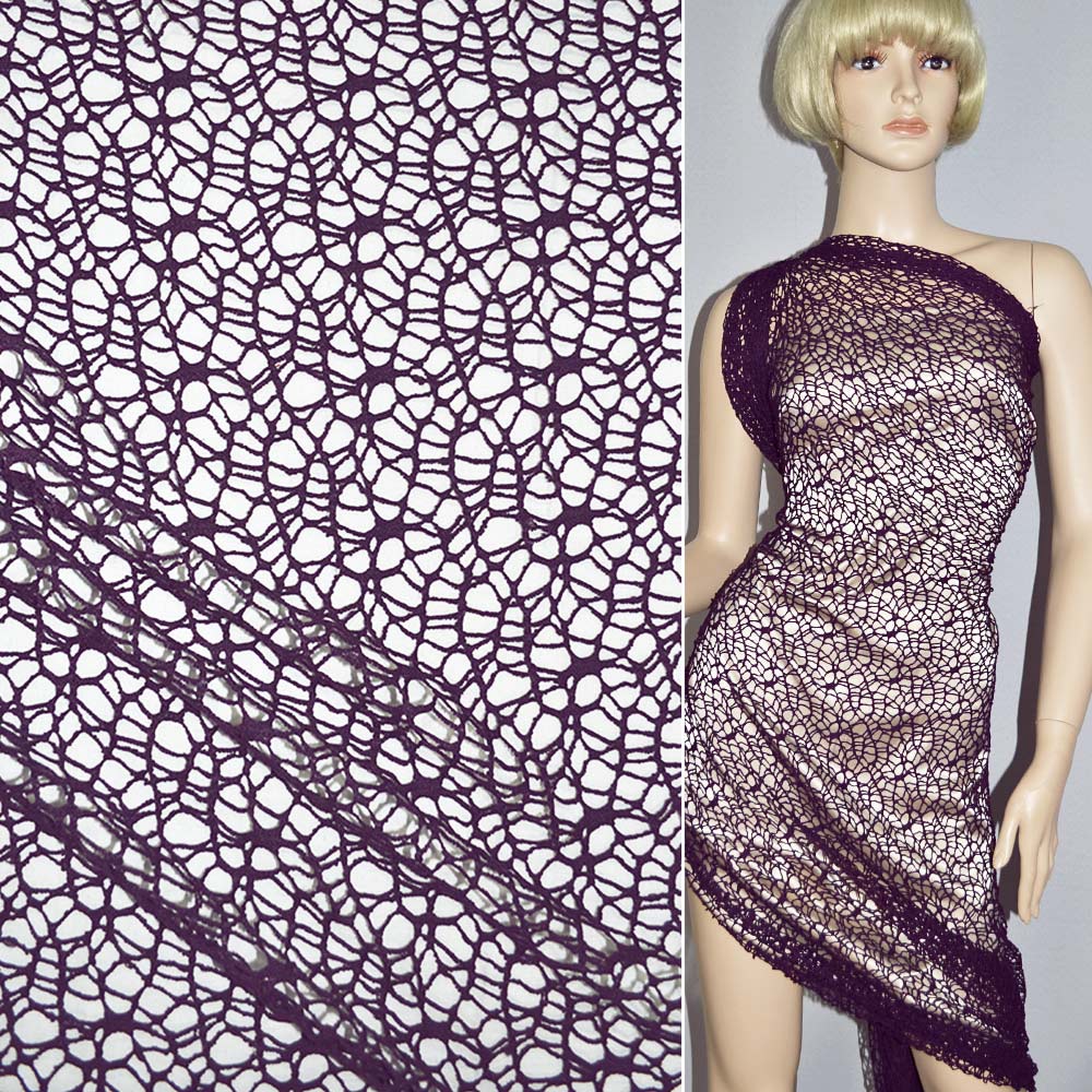 Сетка кружево паутинка фиолетовая темная ш.150. Состав ткани: Полиамид-30, Полиэстер-70. Плотность ткани: 120 г/м.кв. Страна производитель: Южная Корея. Легкий, пластичный, ажурный материал с матовой и фактурной поверхностью. На ощупь мягкий. Эластичный, благодаря сетчатой основе. Материал легко ложится по любой форме и комфортен при носке облегающих изделий. Используется как для пошива одежды на подкладке, так и для отделки. Используется для пошива блуз, топов, платья, юбок, белья, а так же в качестве декора.