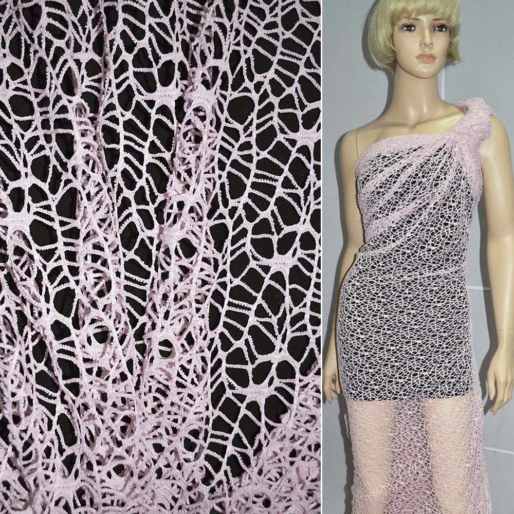 Сетка кружево паутинка розовая бледная ш.150. Состав ткани: Полиамид-30, Полиэстер-70. Плотность ткани: 120 г/м.кв. Страна производитель: Южная Корея. Легкий, пластичный, ажурный материал с матовой и фактурной поверхностью. На ощупь мягкий. Эластичный, благодаря сетчатой основе. Материал легко ложится по любой форме и комфортен при носке облегающих изделий. Используется как для пошива одежды на подкладке, так и для отделки. Используется для пошива блуз, топов, платья, юбок, белья, а так же в качестве декора.