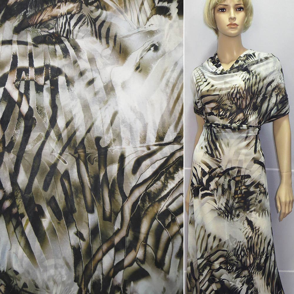Трикотаж хлопковый стрейч молочно-серый с бежево-черным абстрактным рисунком ш.143 купить в розницу и оптом