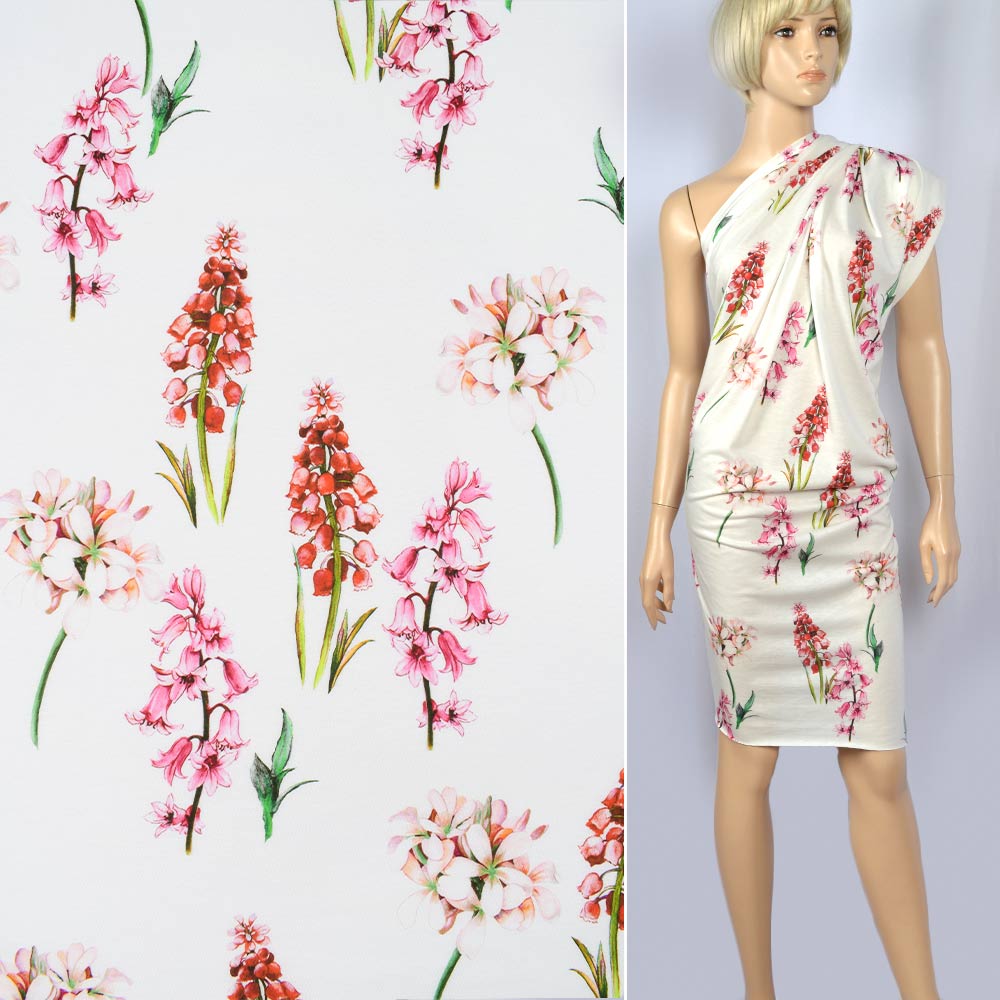 Трикотаж модал с хлопком молочный с розово-зелеными колокольчиками ш.142 купить в розницу и оптом