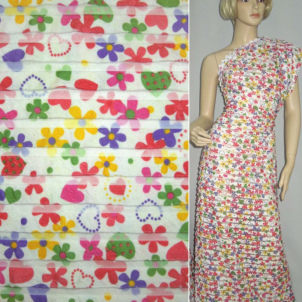 Трикотаж белый с рюшами и цветными цветами ш.150. Состав ткани: Полиакрил-30, Полиамид-30, Полиэстер-30, Эластан-10. Плотность ткани: 246 г/м.кв. Страна производитель: Южная Корея. Трикотаж - это мягкая плотная материя, не прозрачная. Приятная на ощупь, комфортная в носке. Благодаря содержанию синтетических материй, материал более износостойкий и надолго сохраняет свой первоначальный вид. Ткань отличается своей приятной текстурой, хорошей растяжимостью, практически не мнется. Трикотаж достаточно простой в уходе. Используется для пошива платьев, спортивных костюмов, легких жакетов, поло, футболок и многого другого.