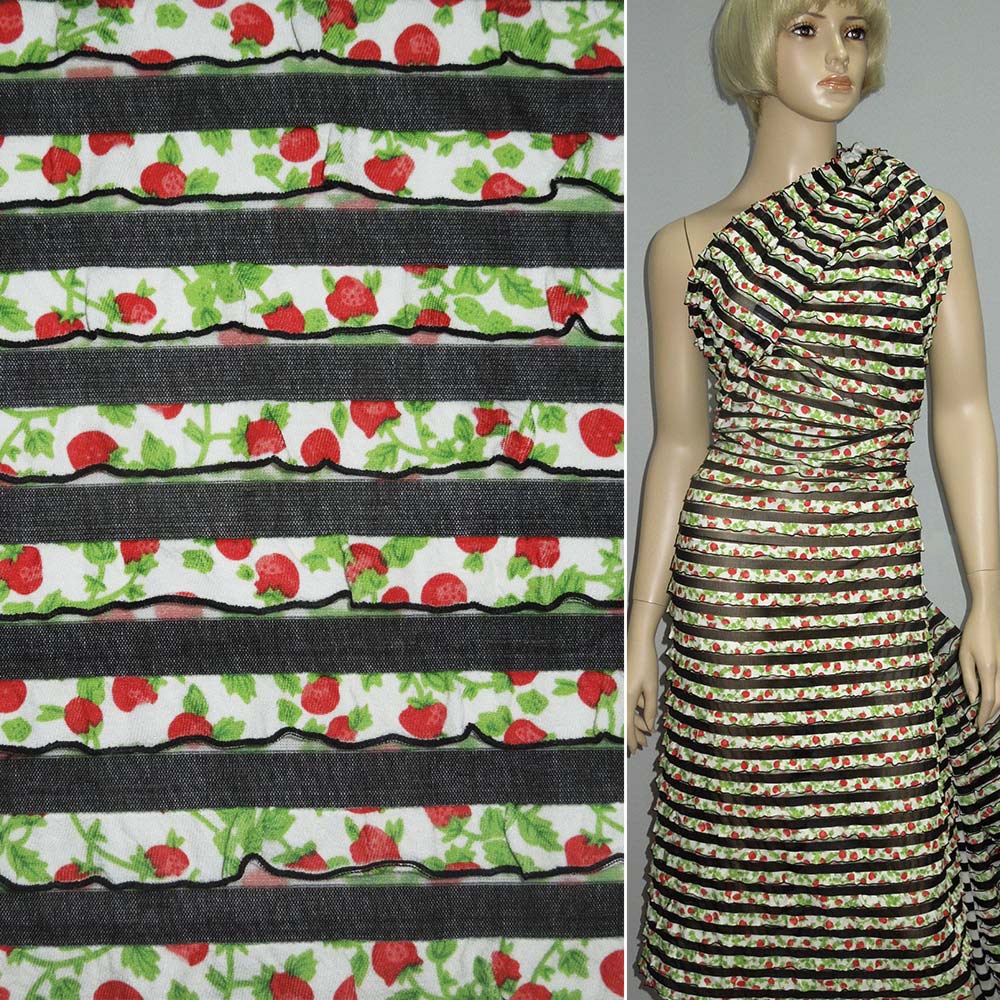 Трикотаж в черно-белые полоски с зелеными рюшами ш.150. Состав ткани: Полиакрил-30, Полиамид-30, Полиэстер-30, Эластан-10. Плотность ткани: 209 г/м.кв. Страна производитель: Южная Корея. Трикотаж - это мягкая плотная материя, не прозрачная. Приятная на ощупь, комфортная в носке. Благодаря содержанию синтетических материй, материал более износостойкий и надолго сохраняет свой первоначальный вид. Ткань отличается своей приятной текстурой, хорошей растяжимостью, практически не мнется. Трикотаж достаточно простой в уходе. Используется для пошива платьев, спортивных костюмов, легких жакетов, поло, футболок и многого другого.