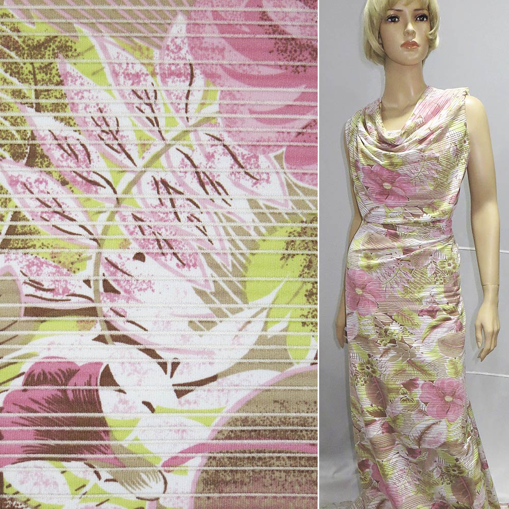 Трикотаж белый с коричнево-салатовыми листьями и розовыми цветками ш.130 купить в розницу и оптом