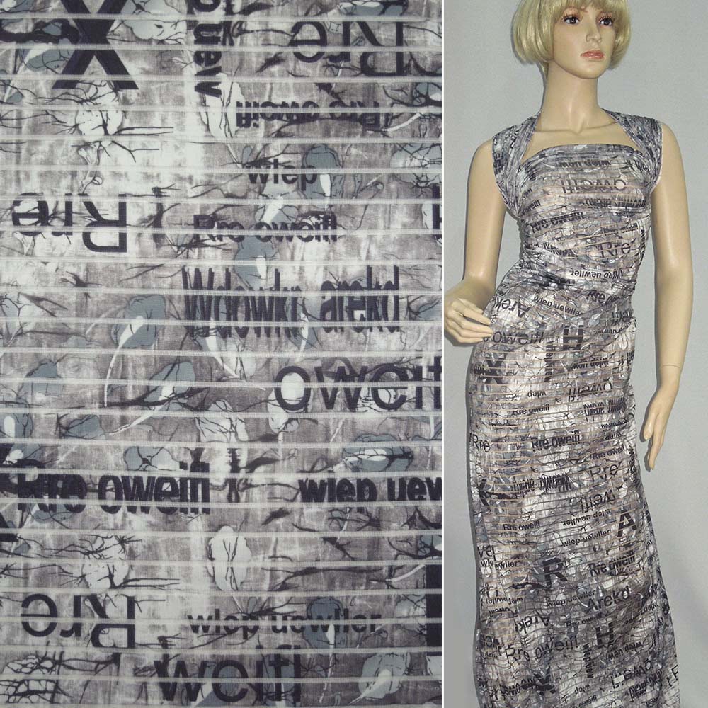 Трикотаж коричнево-белый с прозрачными полосами и черными надписями ш.150 купить в розницу и оптом