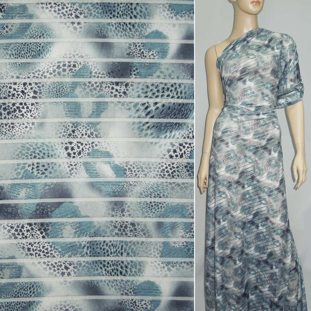Трикотаж серый светлый с прозрачными полосами и бирюзово-черными пятнами ш.150. Состав ткани: Вискоза-30, Полиамид-30, Полиэстер-40. Плотность ткани: 142 г/м.кв. Страна производитель: Южная Корея. Трикотаж - это мягкая плотная материя, не прозрачная. Приятная на ощупь, комфортная в носке. Благодаря содержанию синтетических материй, материал более износостойкий и надолго сохраняет свой первоначальный вид. Ткань отличается своей приятной текстурой, хорошей растяжимостью, практически не мнется. Трикотаж достаточно простой в уходе. Используется для пошива платьев, спортивных костюмов, легких жакетов, поло, футболок и многого другого.