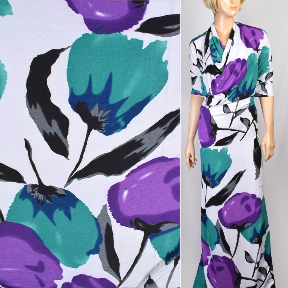 Трикотаж структурные штрихи белый с маками фиолетовыми, бирюзовыми ш.160. Состав ткани: Ацетат-30, Полиамид-30, Полиэстер-35, Эластан-5. Плотность ткани: 179 г/м.кв. Страна производитель: Южная Корея. Трикотаж - это мягкая плотная материя, не прозрачная. Приятная на ощупь, комфортная в носке. Благодаря содержанию синтетических материй, материал более износостойкий и надолго сохраняет свой первоначальный вид. Ткань отличается своей приятной текстурой, хорошей растяжимостью, практически не мнется, хорошо драпируется. Трикотаж достаточно простой в уходе. Используется для пошива платьев, спортивных костюмов, легких жакетов, поло, футболок и многого другого.