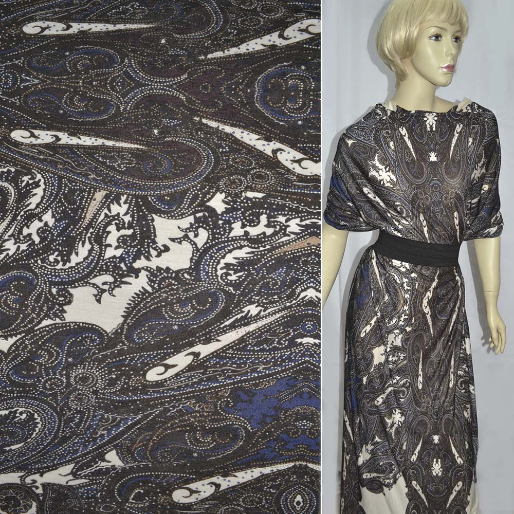Трикотаж вискозний стрейч сине-молочный с коричневыми огурцами ш.150 купить в розницу и оптом