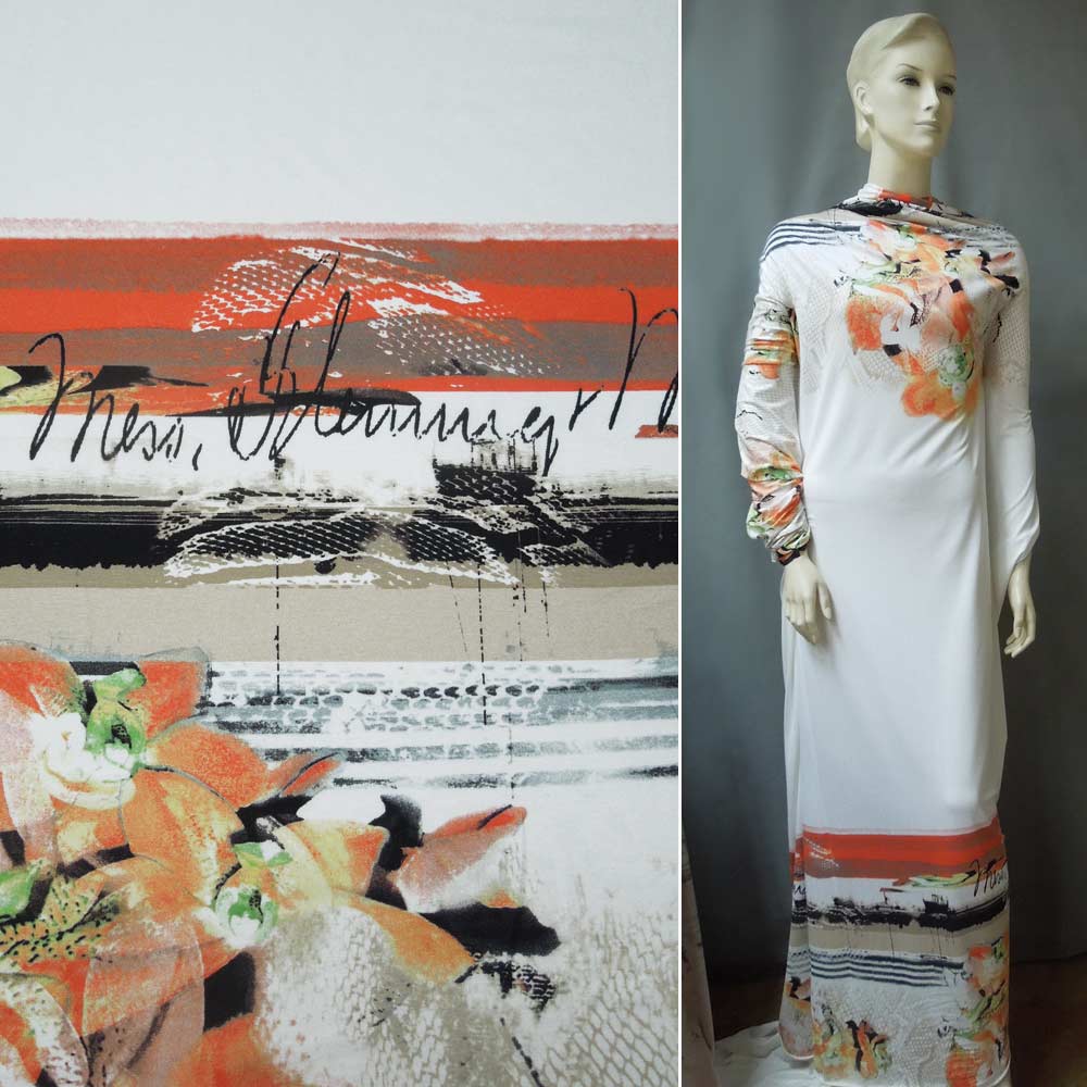 Трикотаж вискозный стрейч белый, розово-бежевые цветы, полоски, принт рептилия, раппорт 113см, ш.140 купить в розницу и оптом