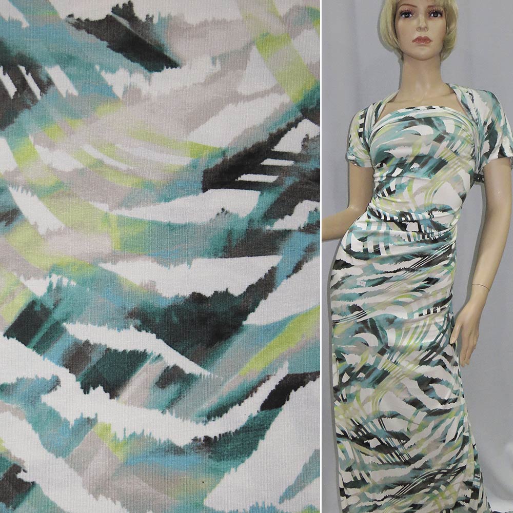 Трикотаж вискозный стрейч белый с бирюзово-серой абстракцией (принт) ш.150 купить в розницу и оптом