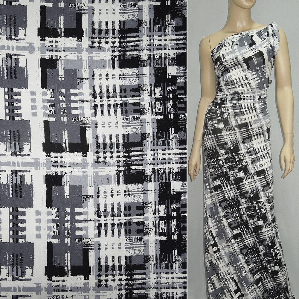 Трикотаж вискозный стрейч белый с черно-серой геометрической абстракцией ш.150 купить в розницу и оптом