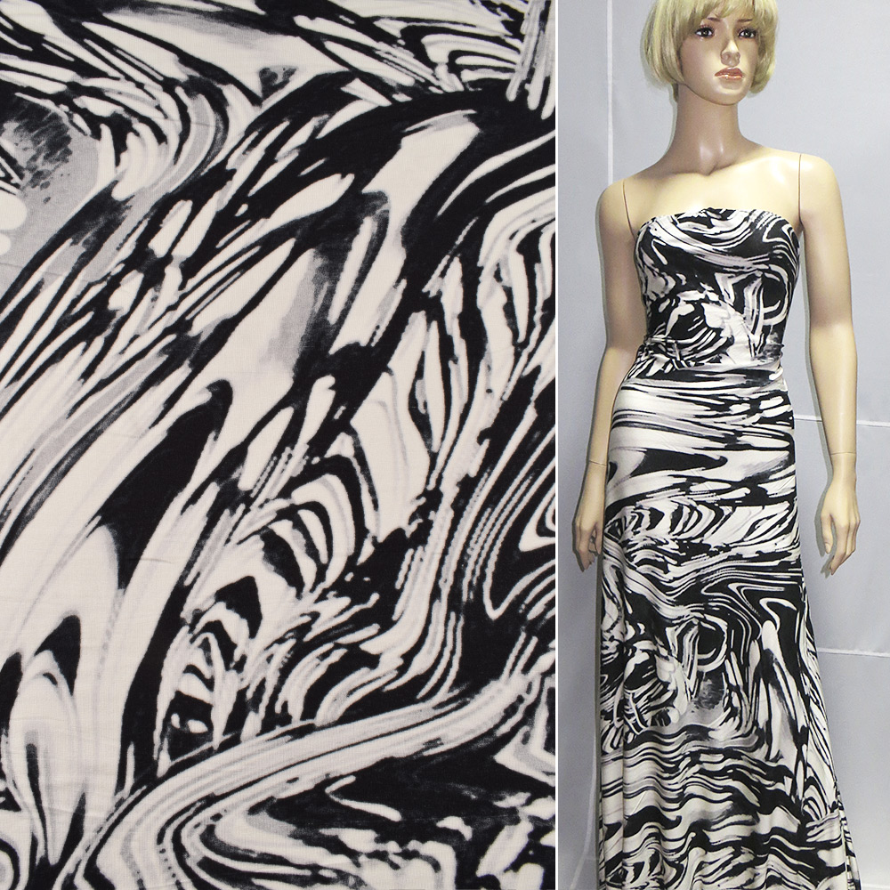 Трикотаж вискозный стрейч белый с черными разводами ш.150 купить в розницу и оптом